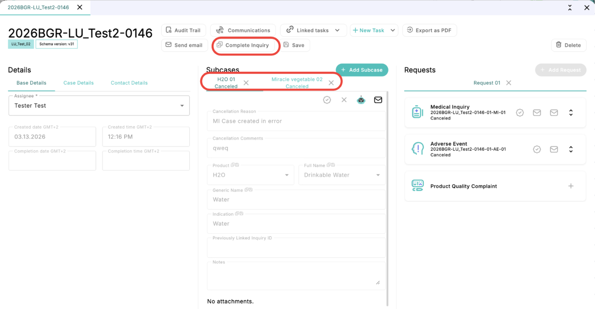To cancel a medical inquiry, all of its Subcases must first be cancelled, and all “Required for Completion” fields in the “Details” section must be filled out.