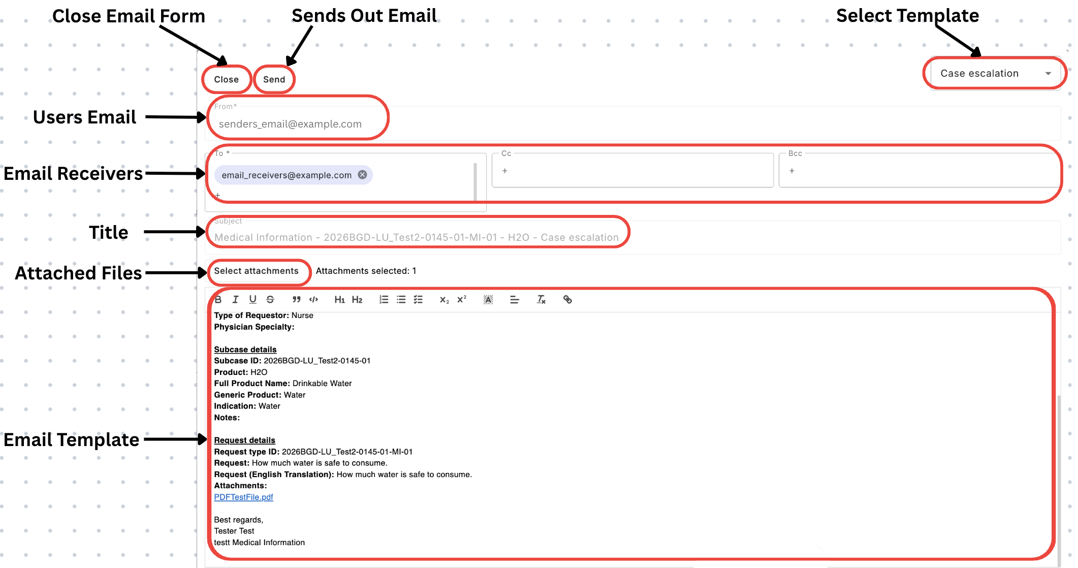 - Send Email – After completing the required email fields, this button allows the user to send the email to the specified recipients.
