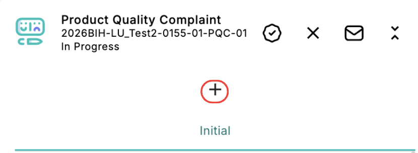 To add follow-ups to an Product Quality Complain Request, the user must first send the case email. Once the email has been sent, the “+” button becomes enabled. Clicking this button adds an additional follow-up to the request.
