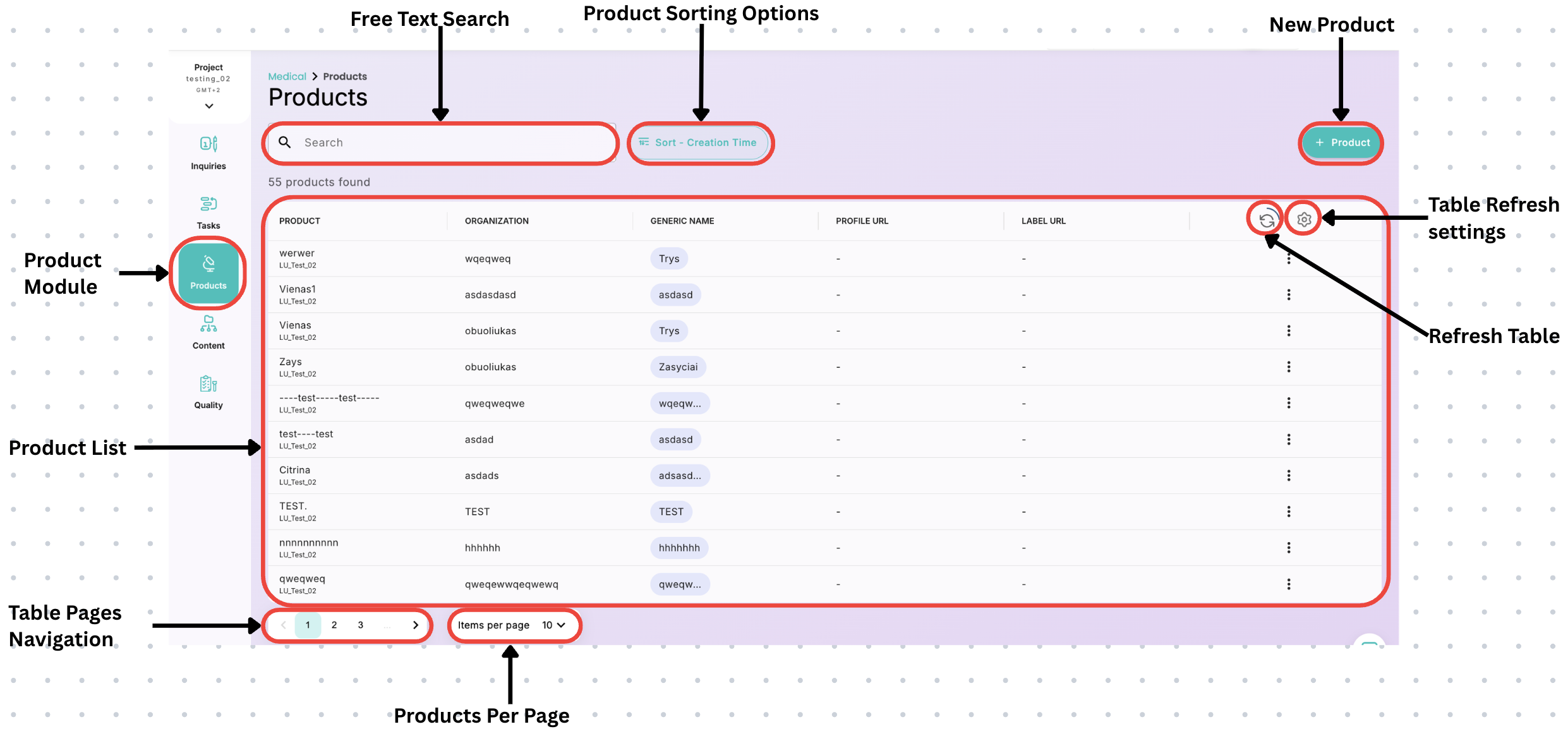 The image above highlights the key elements required to work within the Products Module. A description of each feature is provided below.