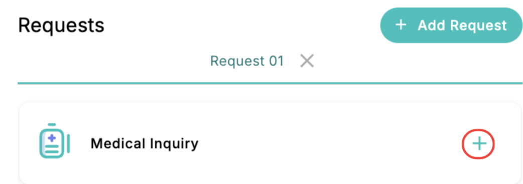 To add a Medical Inquiry Request, click the “+” button in the Requests section located on the left side of the Inquiry form.