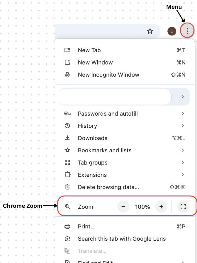 - Browser Zoom – Set the browser zoom level to 75% (recommended) for optimal viewing. To do this, click the three-dot menu (⋮) in the top-right corner of the browser, locate the Zoom option, and click the – (minus) button until the zoom level is 75%.