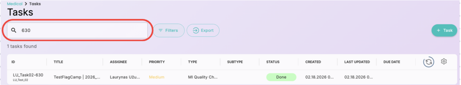 How To Search Tasks Tasks can be searched by entering the partial or full ID/Title of the desired Task in the search field, as shown below. Tasks Module Introduction